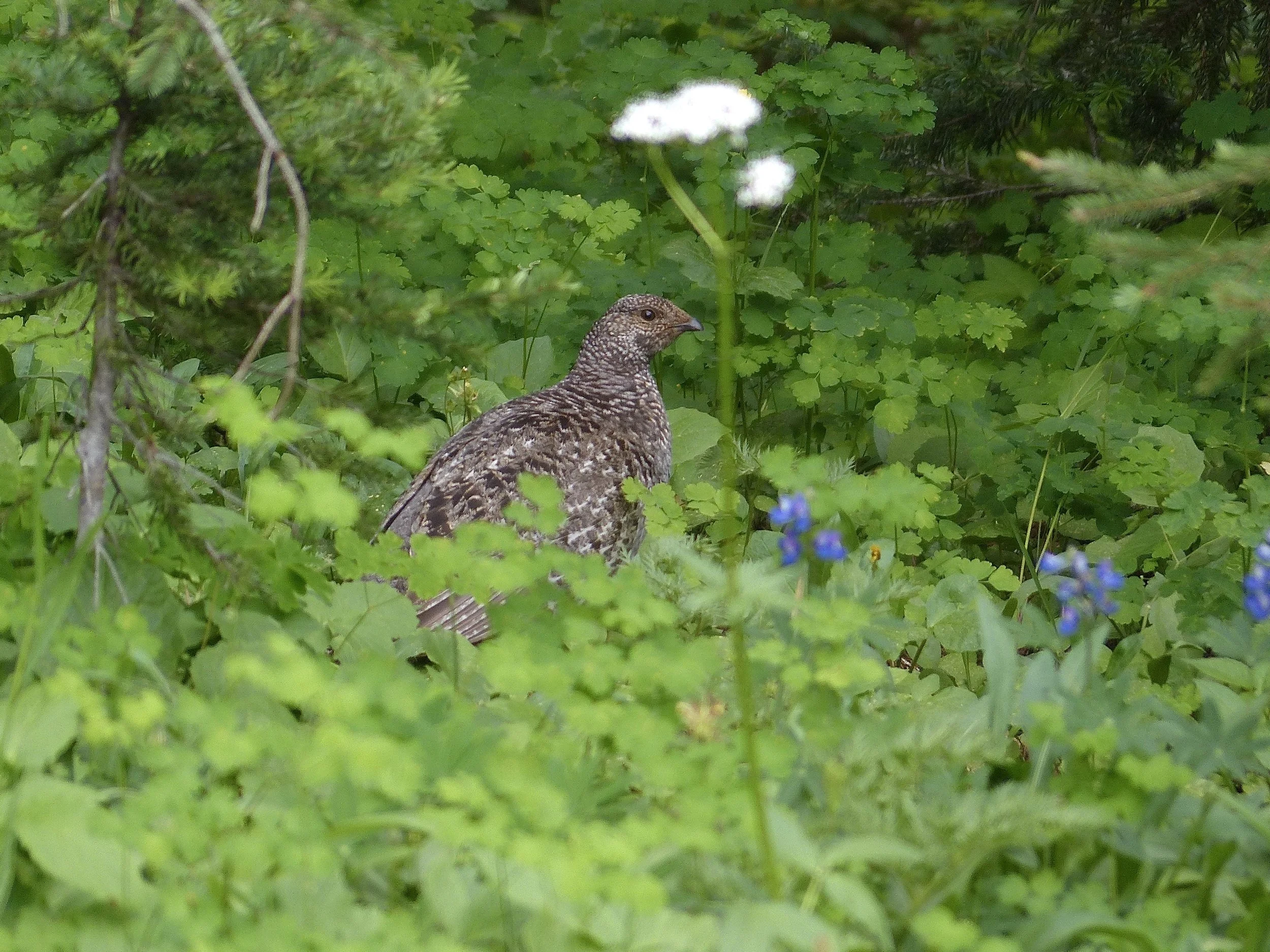Sooty Grouse hen at Alpine Meadows on the Heather Trail with arctic lupines at Manning Park - Photo: Raymond Liu